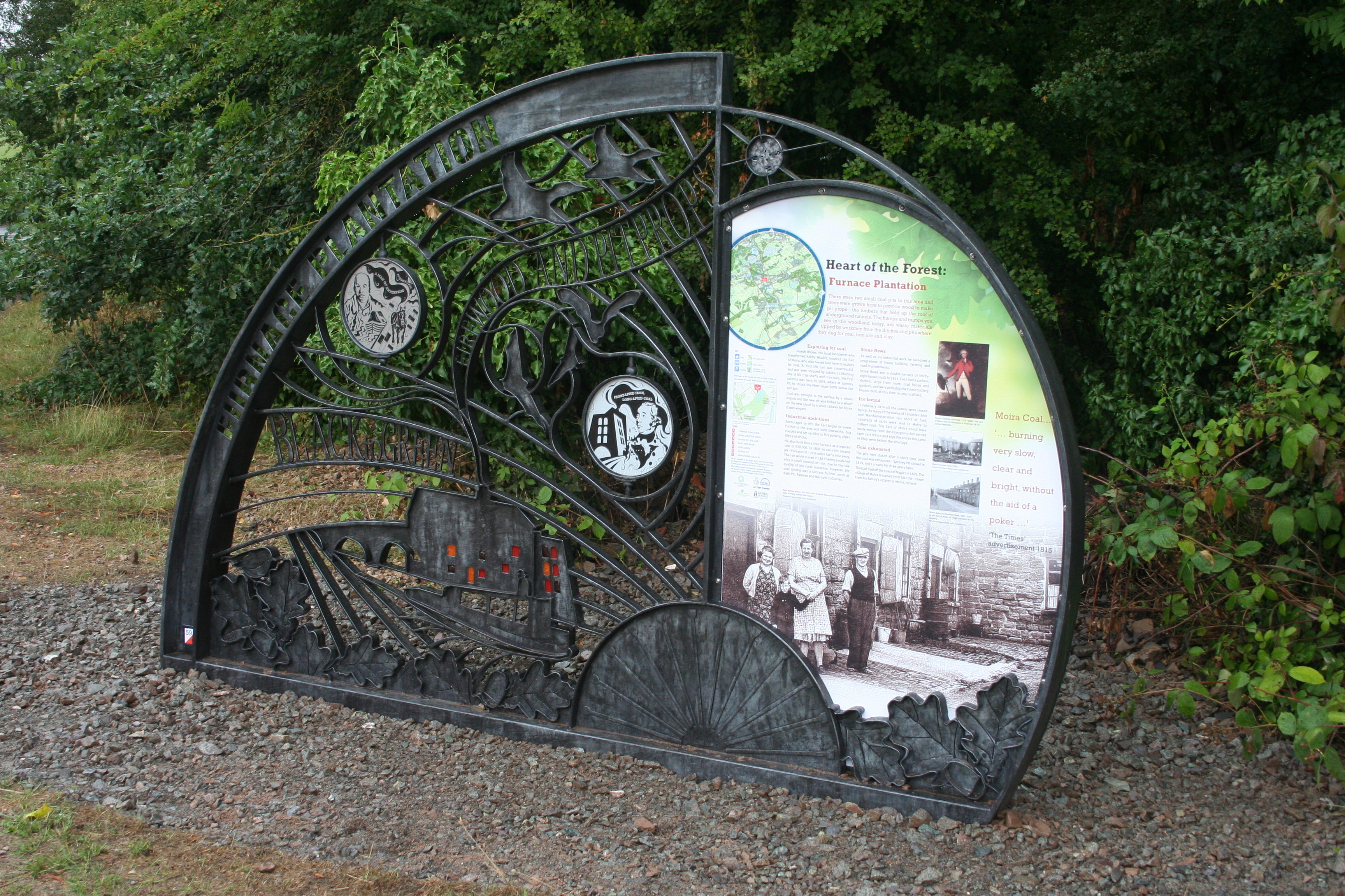 A coming together of industry and ecology is perfectly illustrated in Furnace Wood, with the woodland park sitting alongside an old canal side Napoleonic blast furnace. In an area that was once a hotbed of iron making and industrial ingenuity, a woodland of ash, oak, Scots pine, silver birch, holly, elder and thorn is being regenerated. This 5.3-hectare site was purchased by North West Leicestershire District Council from British Coal in 1996, consisting of woodland, ponds and agricultural grazing land. Three public footpaths cross the site and a stone path has been created through the wood to improve access.