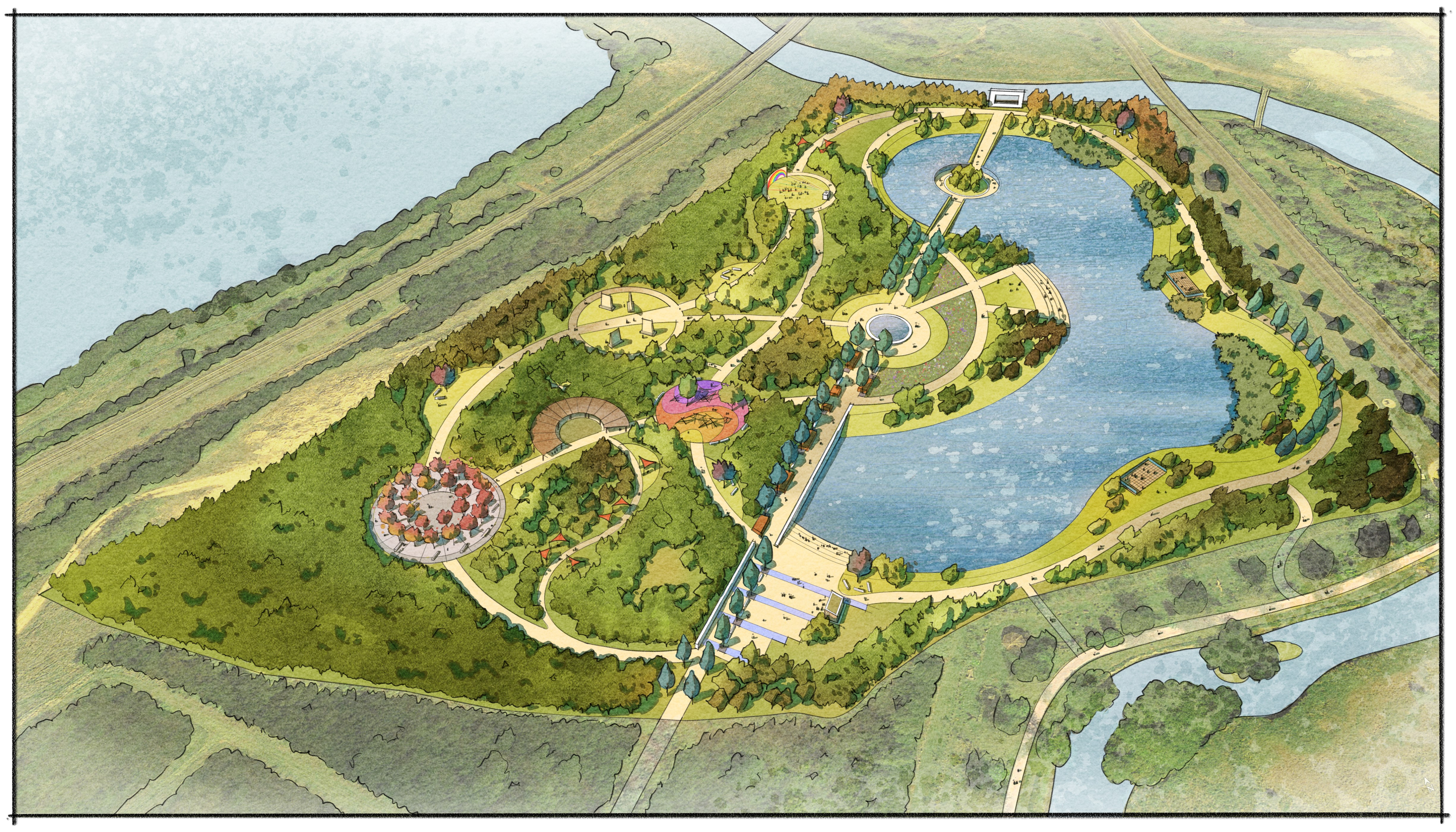 Plans are now being developed on a former quarry adjacent to the arboretum, to transform the existing scrubland and silt pond into an inspirational living landscape, representative of the changing seasons, where people can gather to reflect and contemplate the impact of the pandemic and remember loved ones who have died as a result. The landscape design will feature diverse wildlife habitats and will incorporate reflective glades, areas for gathering and play, an inclusive space for reflection and worship, and an expansive lake.